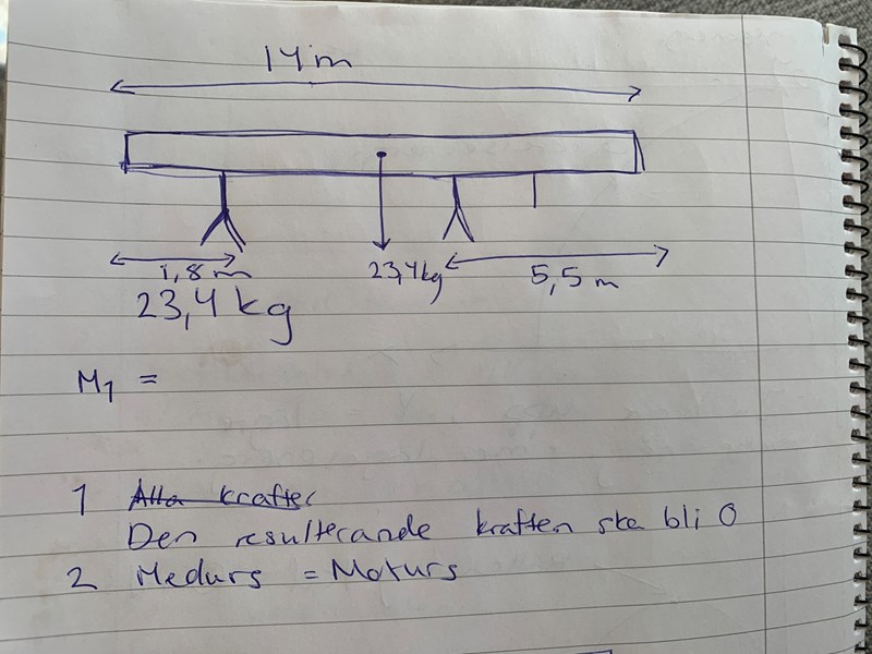 Jag tänker mer att M1= (Där F1 påverkar till mg) och M2=Där F2 påverkar till F1 dvs F2*(14-1,8+5,5) Stämmer det?