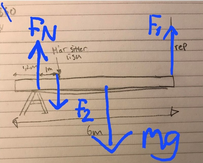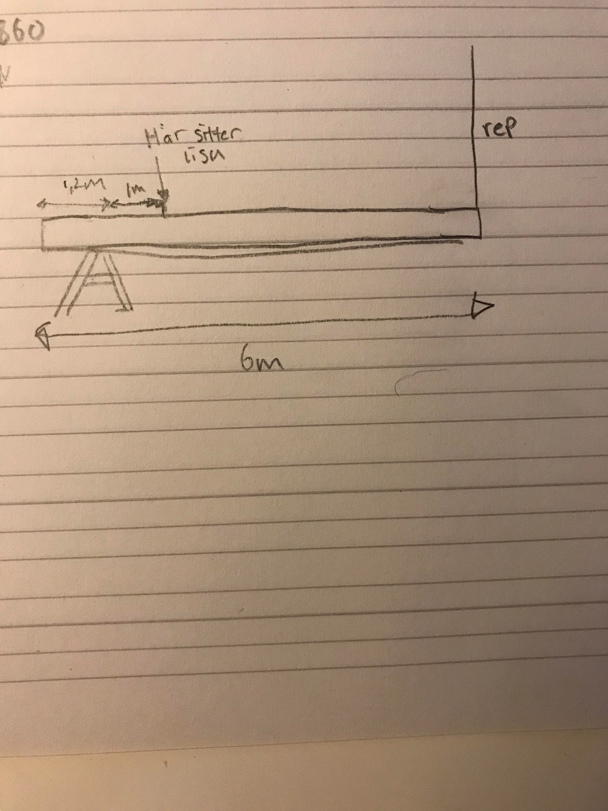 b)När lisa sätter sig på balken ökar spännkraften i repet med 15%. Vad väger lisa? (Lisa sätter sig 1 m åt höger från där järnbocken är)