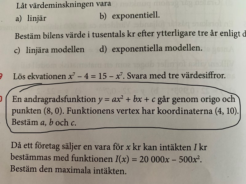 Så man måste ju veta att vertex är en punkt på kurvan. Men egentligen behöver man inte veta att det är vändpunkten.Om man vet att det är vändpunkten finns det andra sätt at lösa denna uppgift, tex derivering. Men annars går det ju bra att bara använda de 2 angivna punkterna och få ett ekvationssystem.