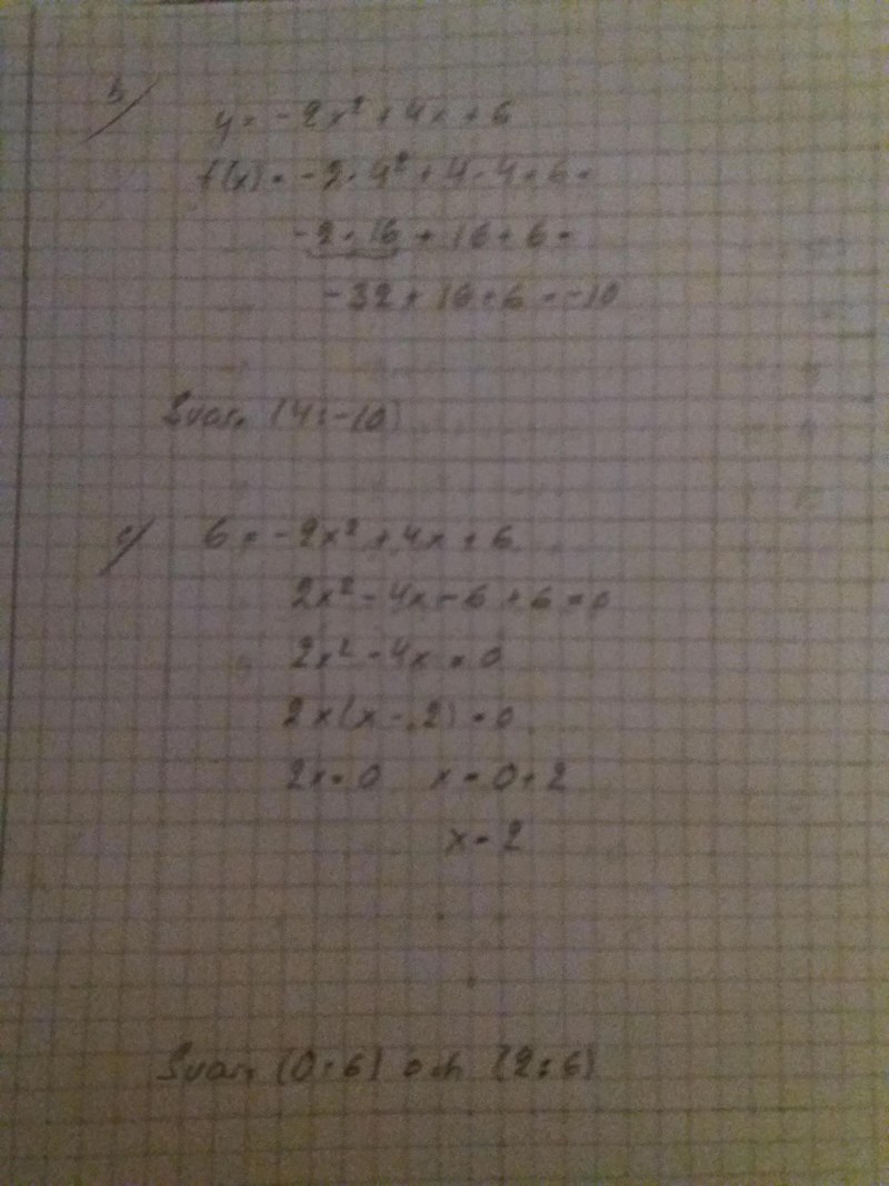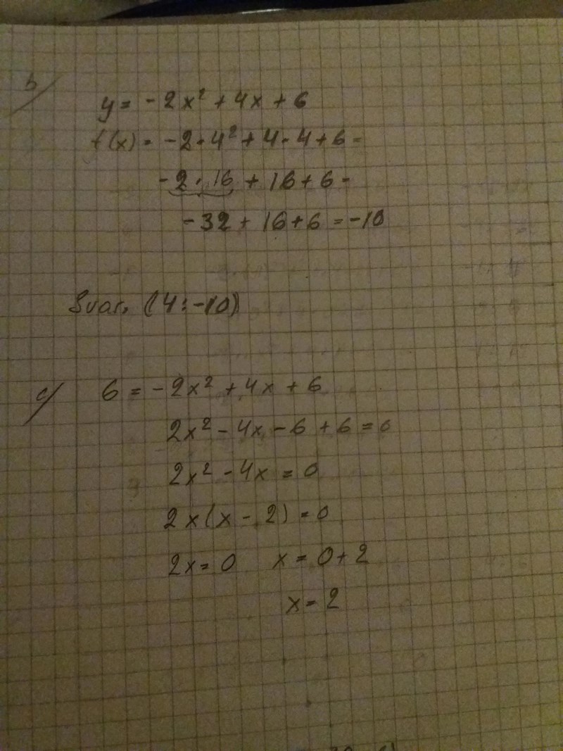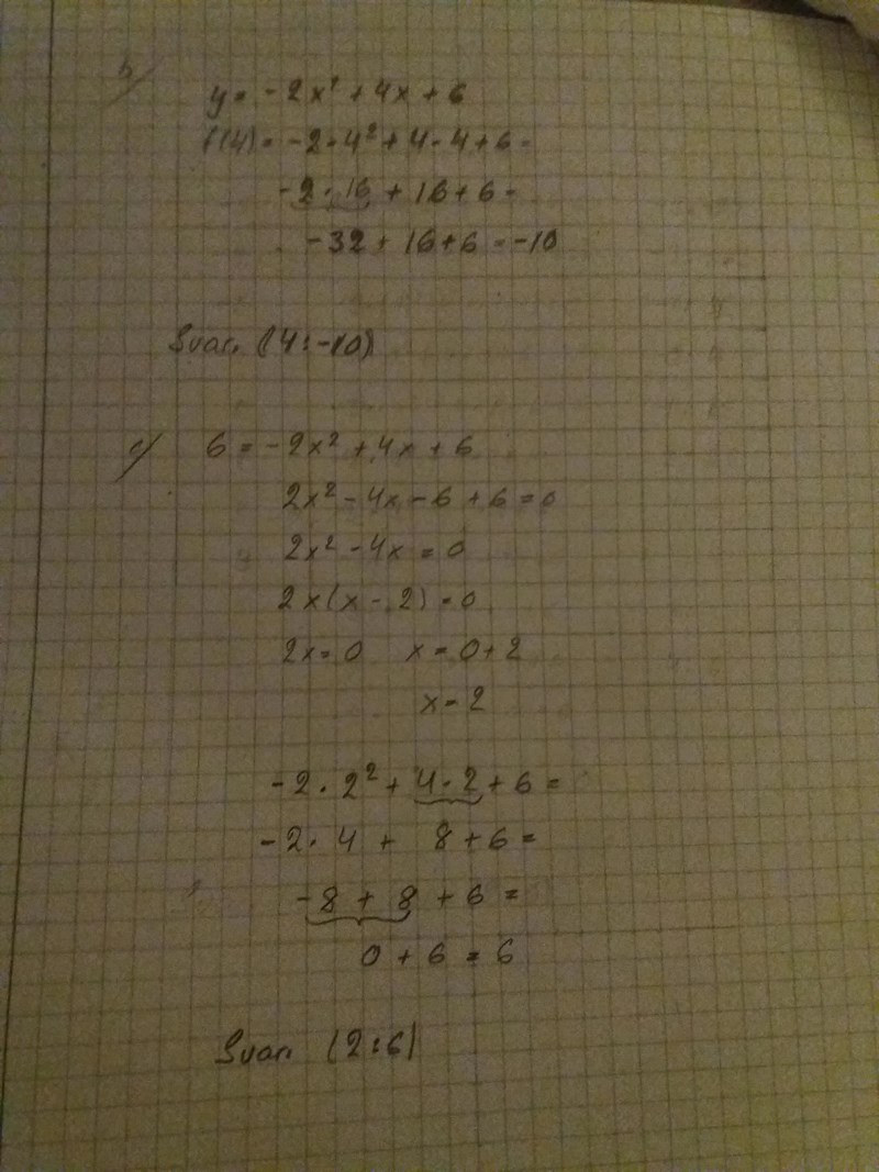 b-uppgiften: Det finns en punkt (x; y) på kurvan där x-koordinaten är 4. Den punkten har x-koordinaten 4 och y-koordinaten är det värde på y som sambandet y = -2x^2 + 4x + 6 ger då x = 4.