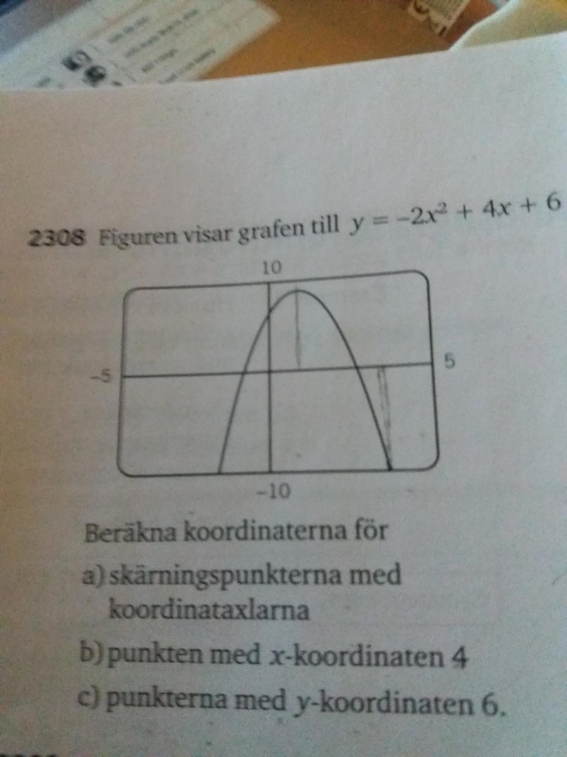 c-uppgiften: Det finns två punkter (x; y) på kurvan där y-koordinaten är 6. x-koordinaterna för dessa punkter ges av sambandet y = -2x^2 + 4x + 6 där y = 6.