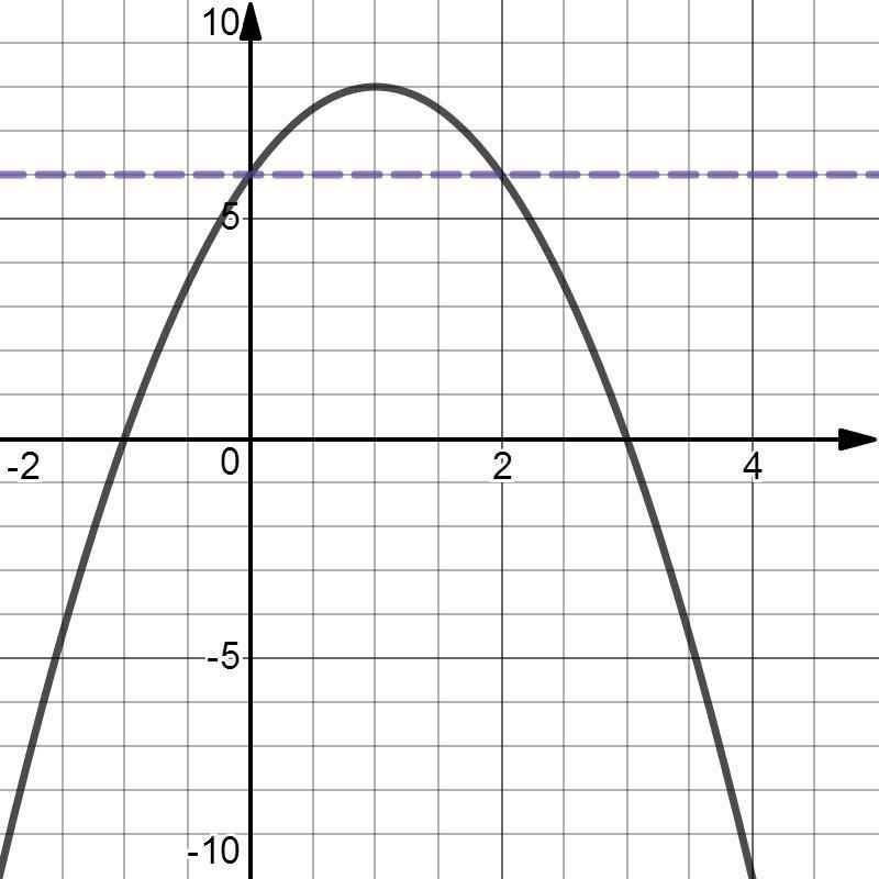 Om du löser ekvationen -2x^2 + 4x + 6 = 6 så får du fram x-koordinaterna för de punkter där grafen till y =-2x^2 + 4x + 6 skär eller tangerar den horisontella linjen y = 6.