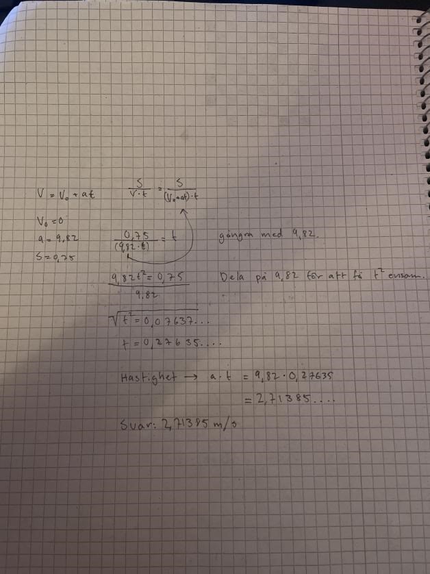 Först och främst så läser jag fysik 1 så det du säger är nytt för mig, men då behöver jag extra hjälp från dig för att lösa denna uppgiften med ditt metod. så grejen är att vi vet inte vad är massan. och för att få g så måste vi få (m/s2) vilket m är massan. Det enda vi har är h= 0-0.75m=-0.75m. Sen är det att eftersom hen börjar falla så v_0=0 då ska vi använda mv_1^2/2=mgh som till slut get oss v_1 = . men problemet är då vad ska g vara(tal).