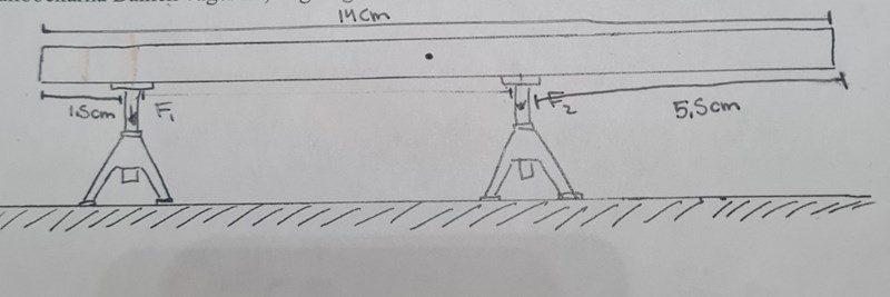 F2*(avståndet mellan bockarna)=. mg*(avstånd vä bock till balkens tyngspunkt)
