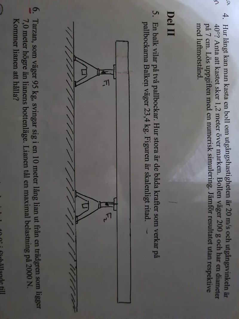 F2 x (avstånd mellan bockarna) = mg x (Avstånd till V bock till balkens tyngdpunkt) => 0.067 x F2 = 23.4 kg x 9.82 x 0.052 => F2 = 11,948976/0.067 => F2 = 178,3429253731 N