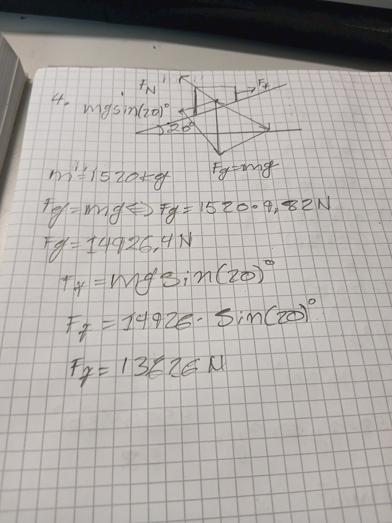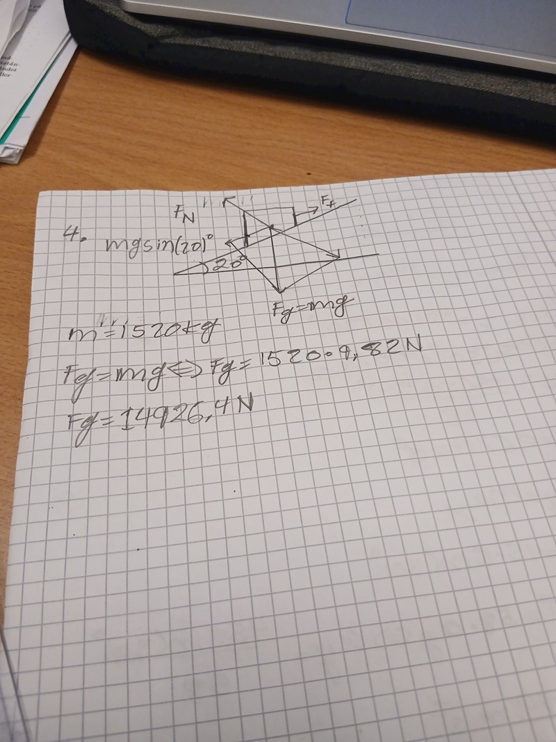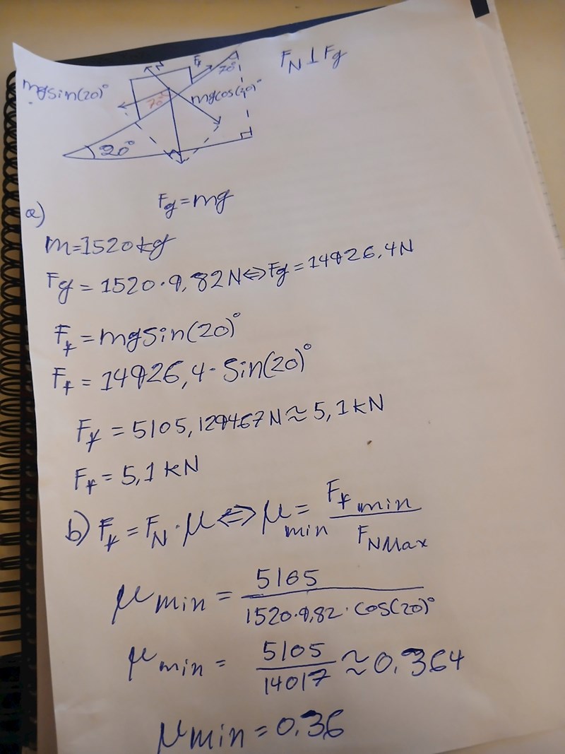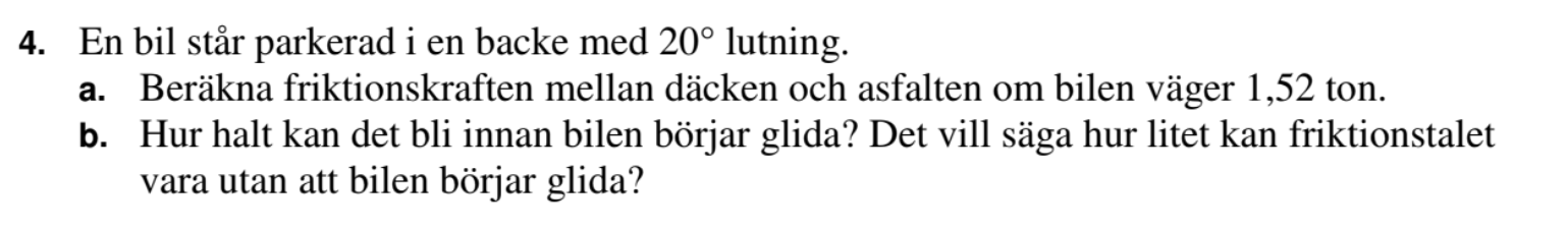Kan du säga något om hur friktionskraften Ff förhåller sig till tyngdkraftens komposant längs med vägbanan, dvs mg*sin(20°)?