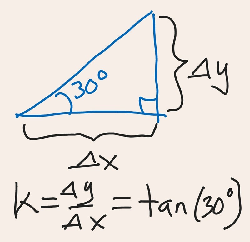 Vad representerar en lutning på en rät linje k? Hur kan du relatera den till lutningen som är given som 30 grader?