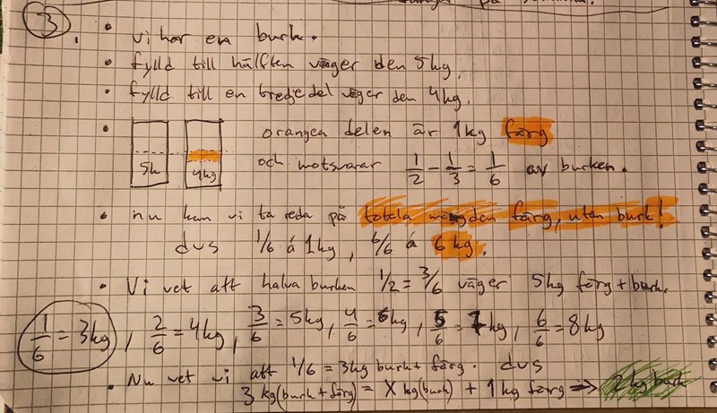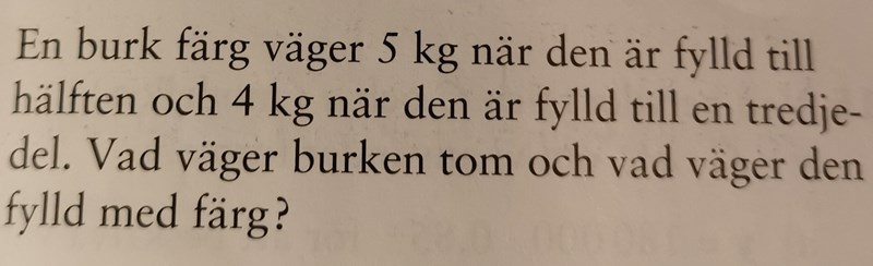 Sätt burkens vikt till x och bilda en ekvation med hjälp av textens första del av mening 1, t ex
