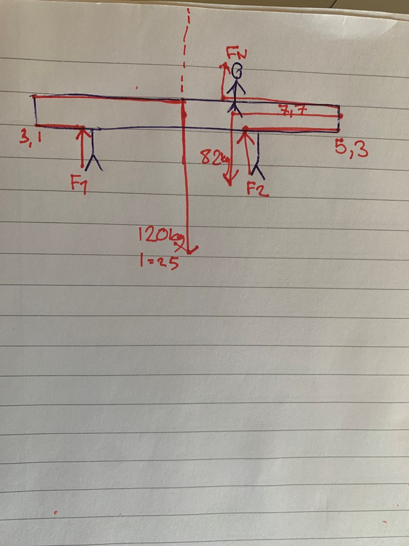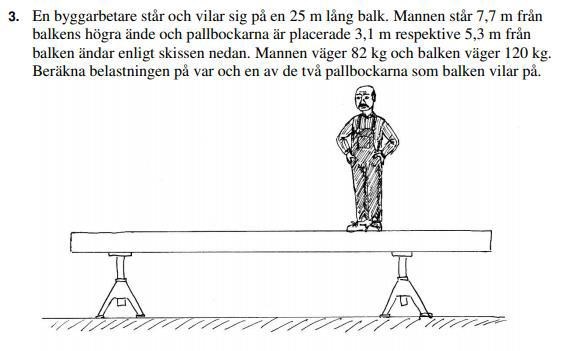 Krafterna och är okända och bestäms genom att beräkna momentet kring punkterna de angriper. Om du beräknar moment kring den vänstra pallbocken kommer hävarmen för som vi kan kalla vara lika med noll. Däremot kommer du kunna bestämma därför att tyngden från balken och gubben är kända. Det enda du behöver ta reda på är krafternas hävarmar.