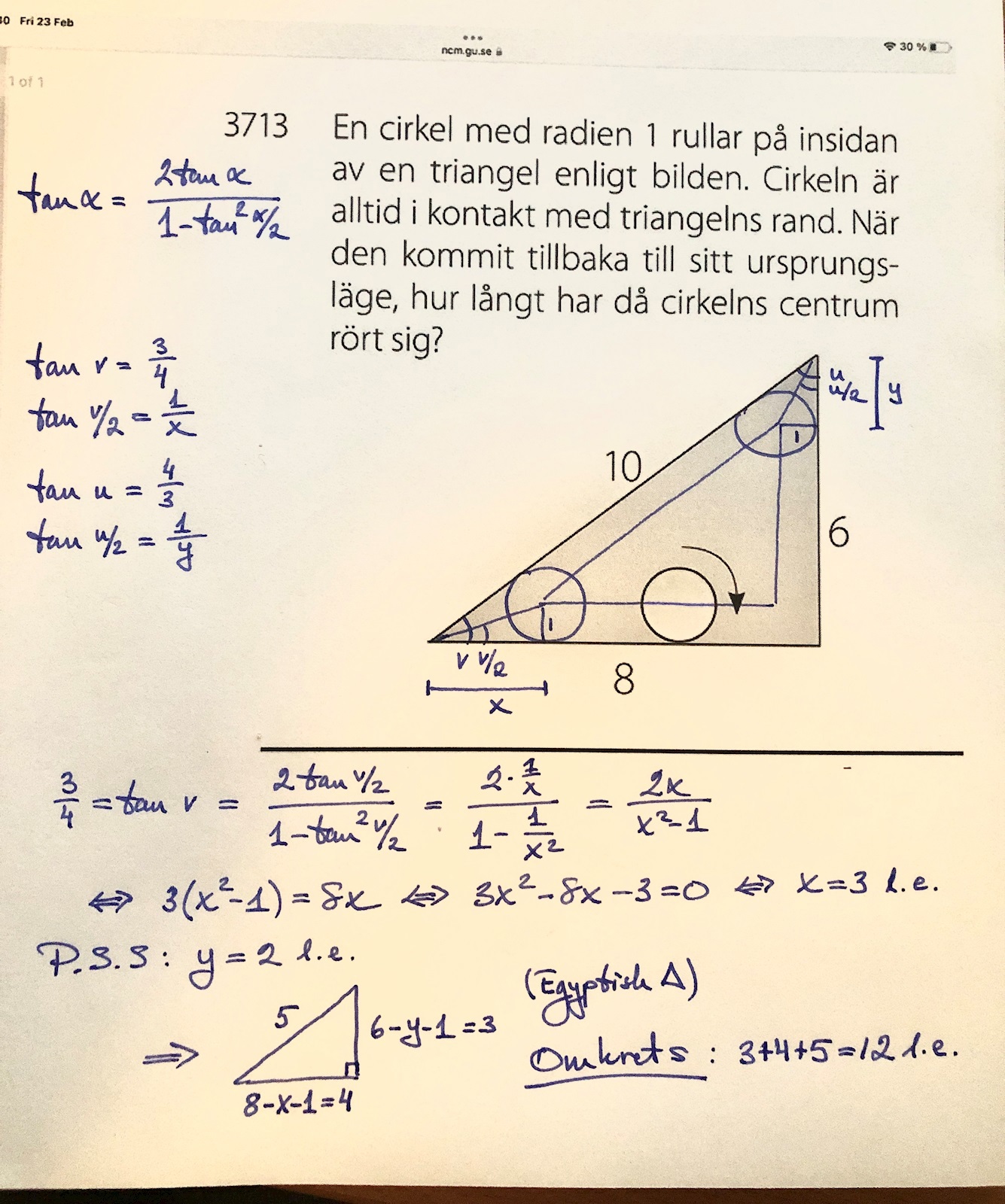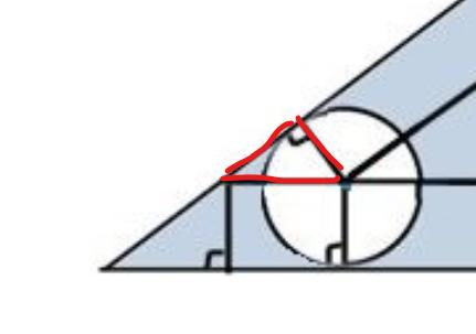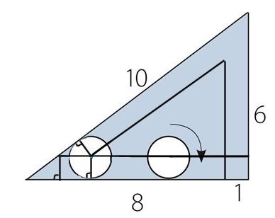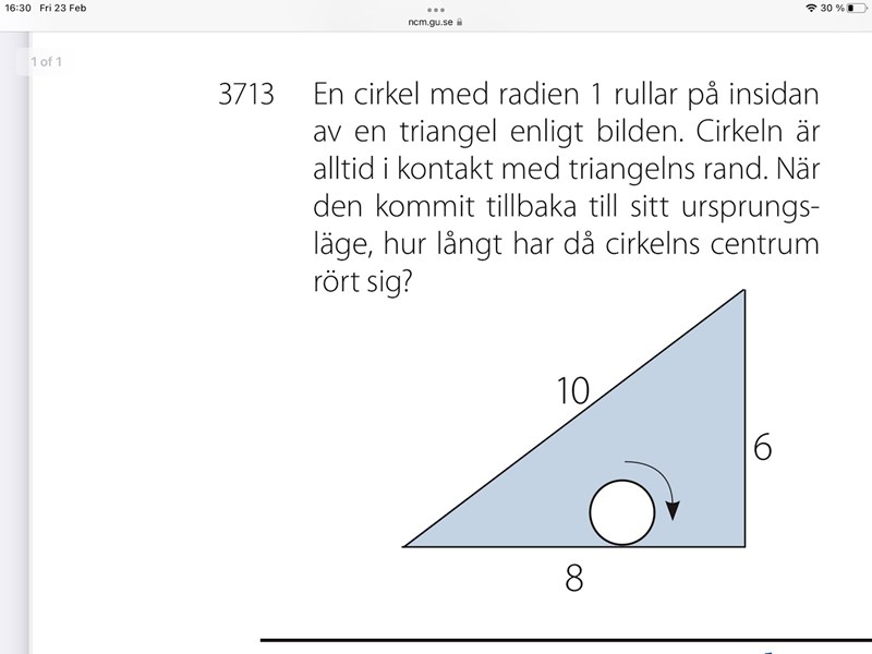 Det är en cirkel som rullar runt. Det är när vi ritar den i hörnet, tangerad av två sidor, som vi kan räkna fram de sträckor som vi behöver. Alltså sidorna i de två små trianglarna. Den ursprungliga figurens cirkel har vi ingen användning för i räkningarna.