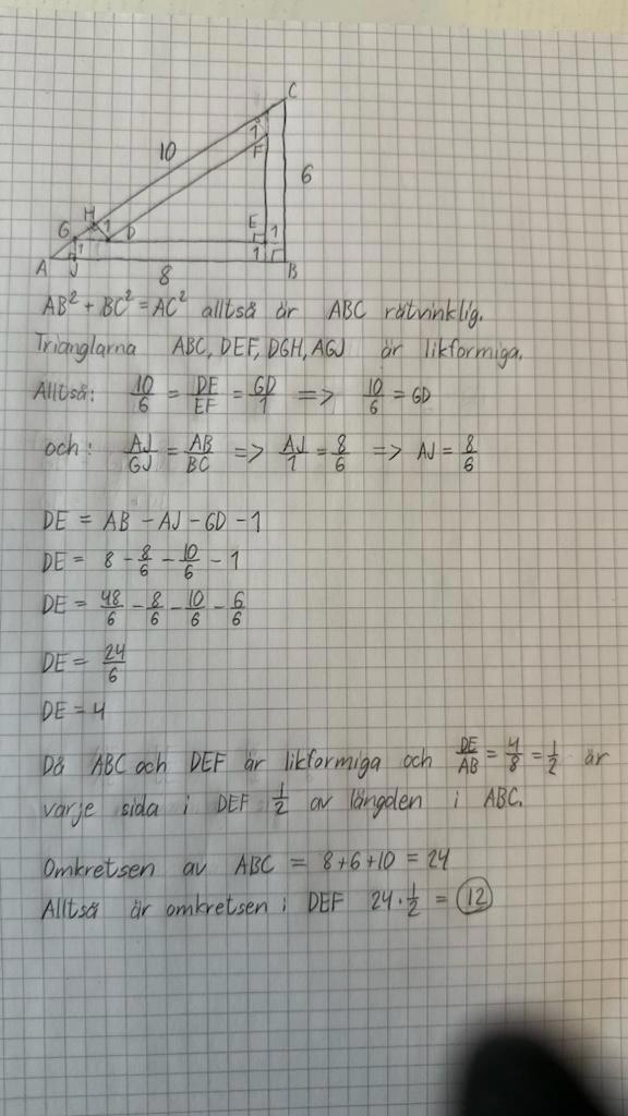 Omkretsen av stora triangeln är 8 + 6 + 10 = 24, det ser man från början.