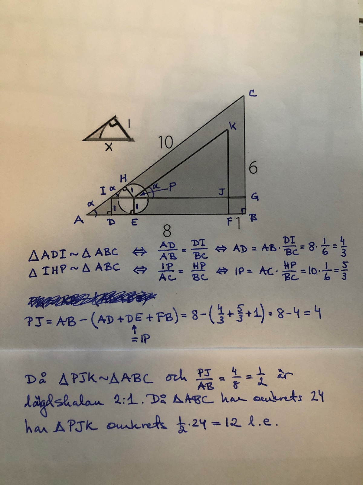Utan bilden som Louis la upp skulle jag inte ha kommit på den metoden. Louis skrev ju också att man kan lösa uppgiften utan trigonometri.