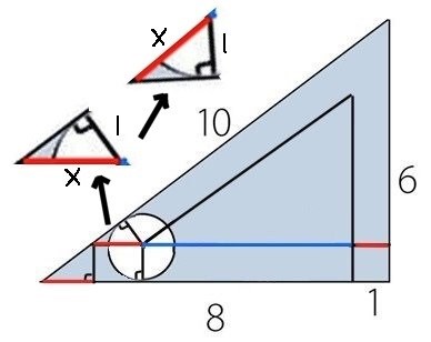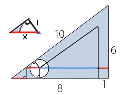 Om x är 3 så blir DB=5, och basen på den inre triangeln blir 8-5-1=4(vi måste ju dra bort radien när cirkeln är nederst till vänster.)