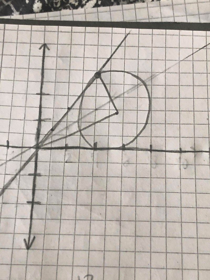 Dra radien från cirkelns centrum mot tangeringspunkten på x-axeln.
