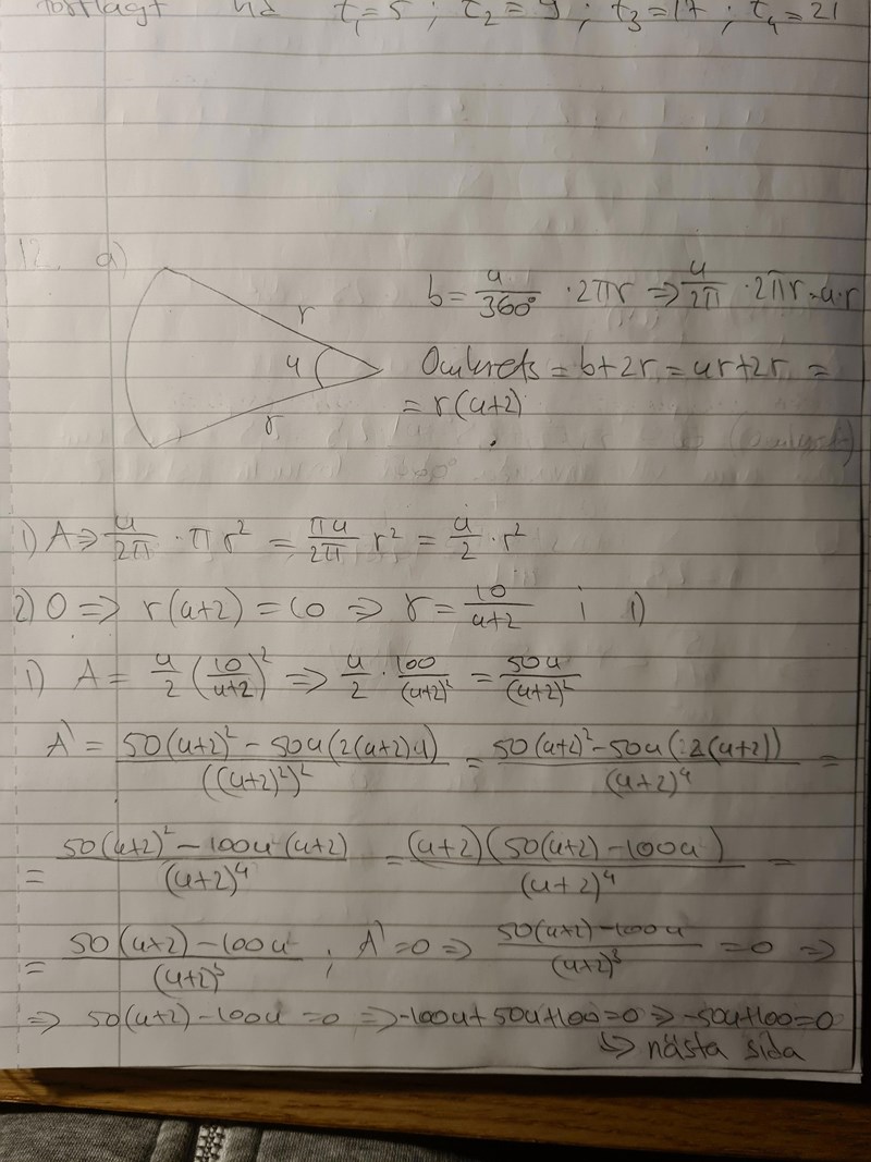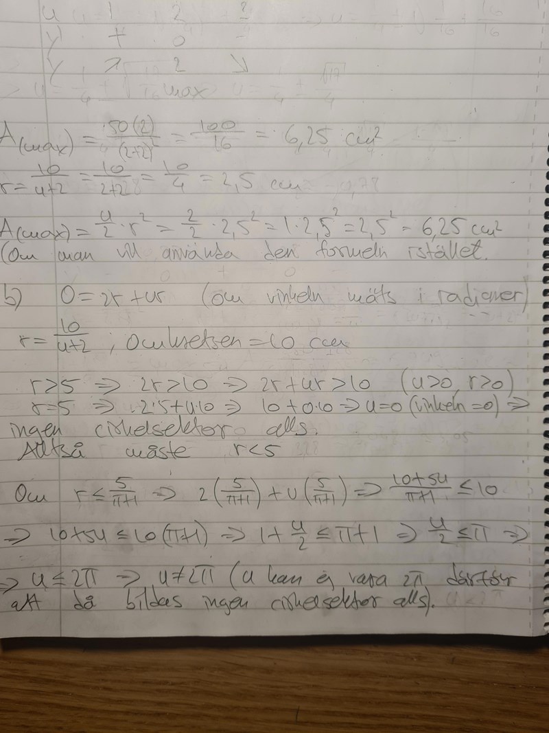 I denna uppgift ska man beräkna den största arean på en cirkelsektor med omkretsen 10 cm. Mitt svar blev ca. 5,95 cm^2. Har jag beräknat arean rätt? Har jag bevisat att radien ligger inom intervallet på delfrågan b)?