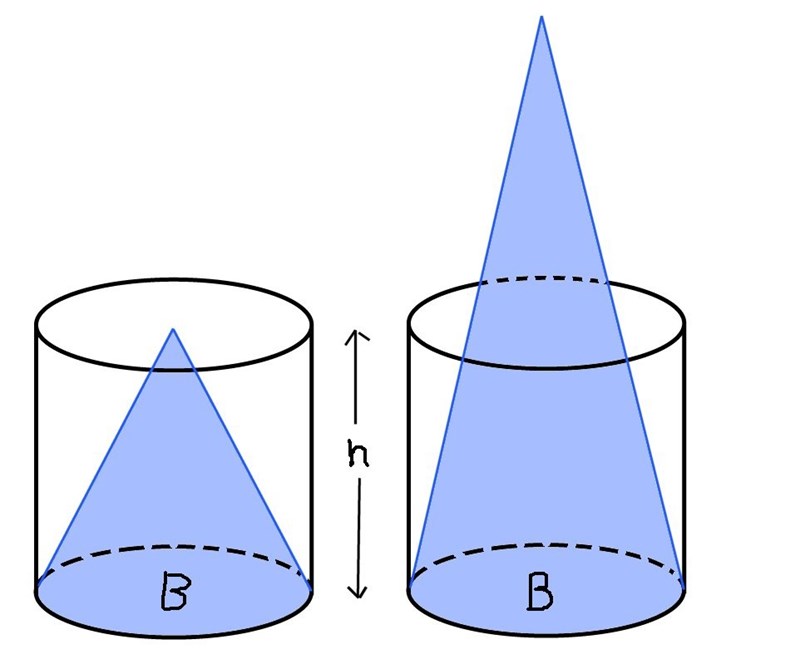 Formlerna säger att i fallet till vänster är konens volym 1/3 av cylinderns.