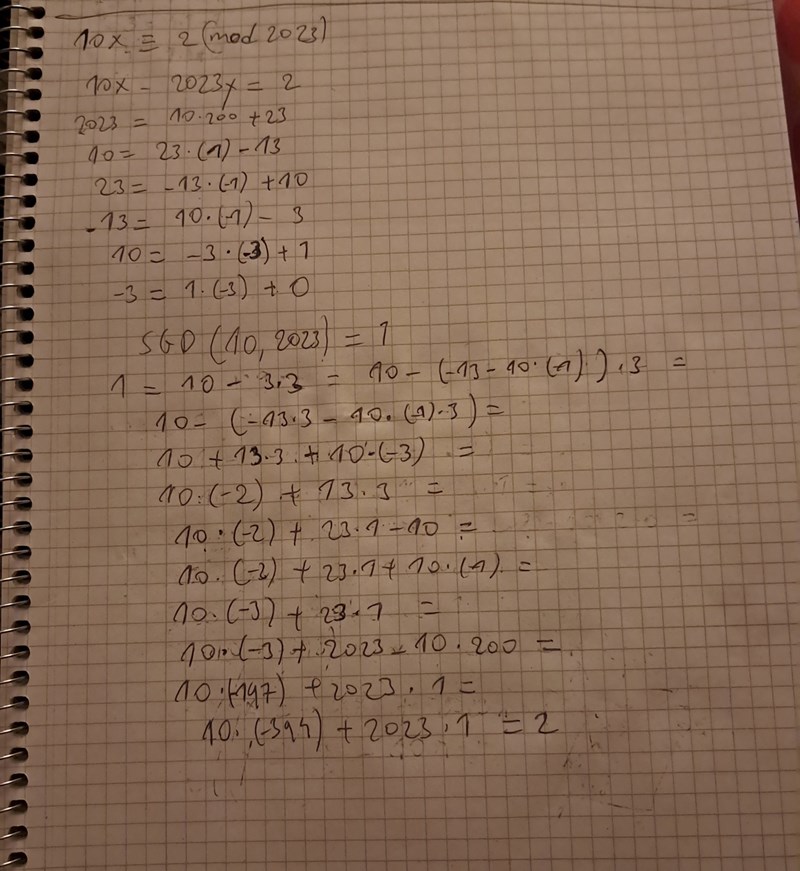 Jag använde euklides algoritm i början men tydligen var jag ej klar då jag bara fick 10*200+23 och det var tydligen fel enligt dig. Jag vet ej om man ska genomföra liggande stolen samtidigt som man använder euklides algoritm. Så resten ska alltid vara mindre än talet som delar 2023?