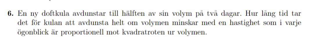Enligt uppgiften ska doftkulans volym minska med en hastighet proportionell mot kvadratroten ur , alltså
