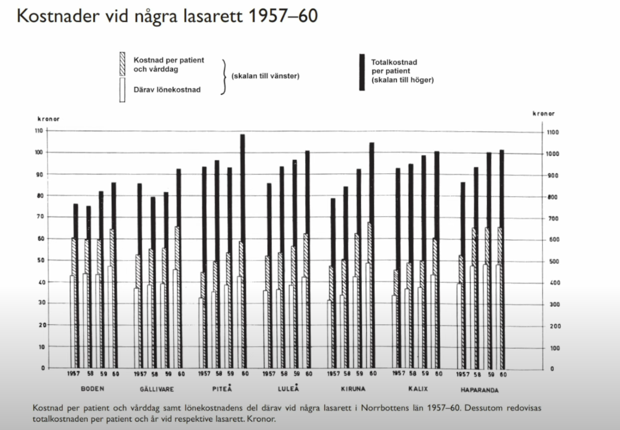 Och det står därav lönekostanden som blir i luleå 1959 38. Men frågan säger hur stor var då kostnaden per patient och vårddag är detta inte redan 58? allstå bokstavligen den svarta staplen? för om du tar bort lönekostanden vad blir det kvar?