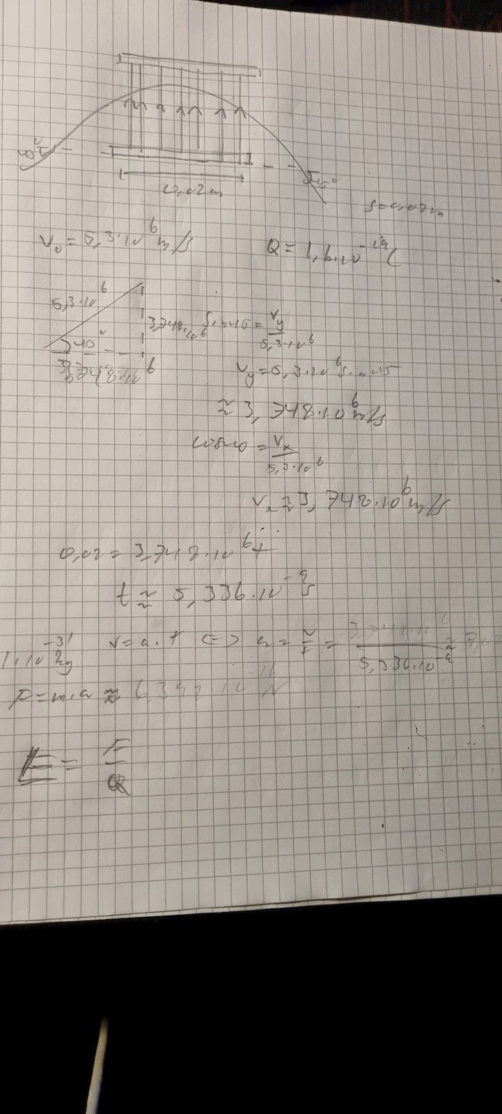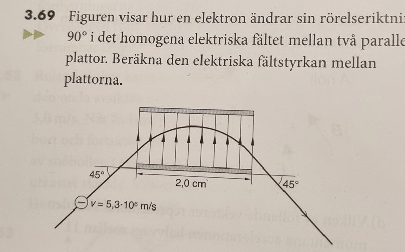 Har problem med denna uppgiften om elektriska fält. Har kommit så pass långt att jag delat upp de hastighetskomposanter och då har kommit fram till den tid som det tar för elektronen att förflytta sig genom fältet. Jag tänkte använda formeln F=m*a men lyckas inte få rätt acceleration när jag räknar ut den med a=v/t. Hur får jag rätt acceleration?