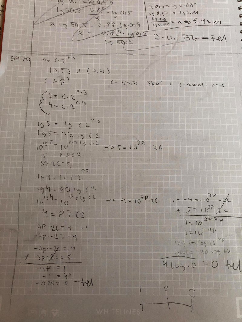 En Exponentialfunktion y=c*2^(px) går genom (3;5)&(7,4) bestäm c och p uppgift 3470 liber ma2c