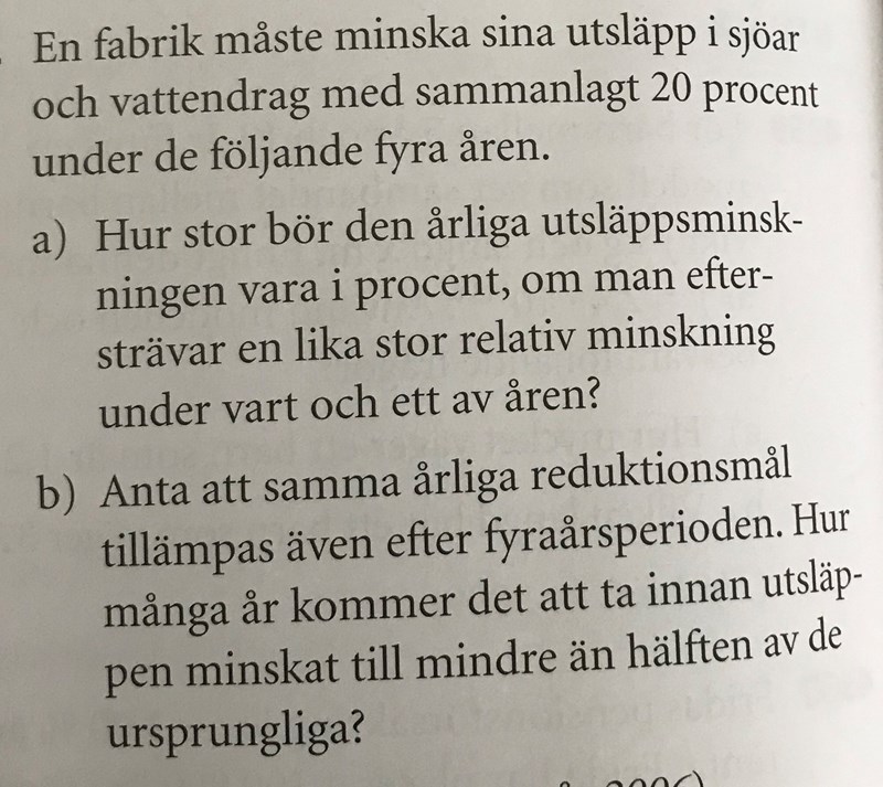 Nej, det står inte att minskningen skall vara 20 % per år, det står att minskningen skall vara 20 % efter fyra år. Kalla förändringsfaktorn för nånting, t ex f. Om utsläppen är U från början, så är utsläppe enter 1 år lika med Uf och efter två år är de Uf2. Kommer du vidare?