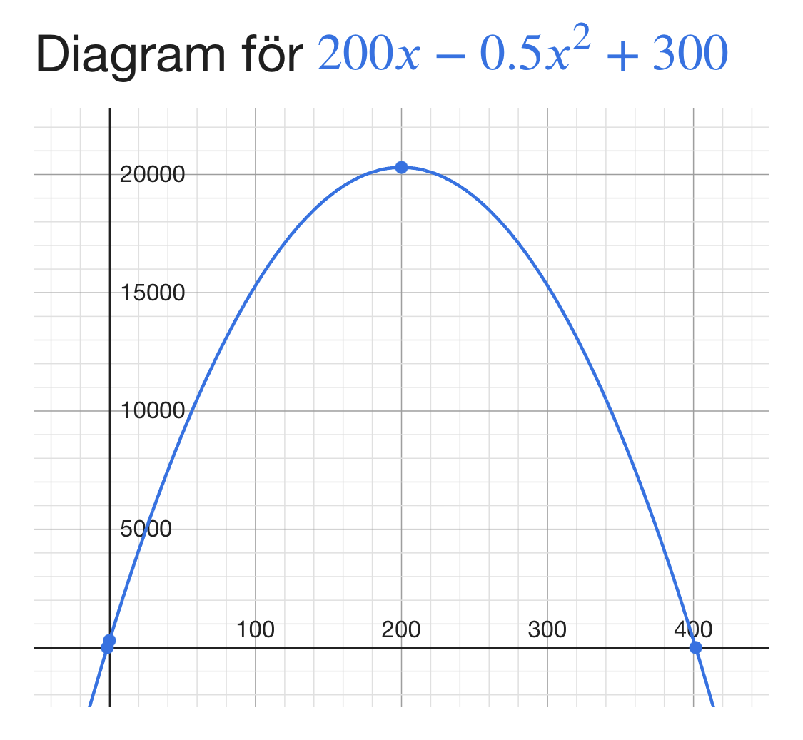Modellen innebär att företaget tjänar pengar på själva tillverkningen (d.v.s. utan att sälja något) ifall de producerar mer är x=400, d.v.s. mer än 40000 enheter. Något sådant är verklighetsfrånvänt på riktigt.