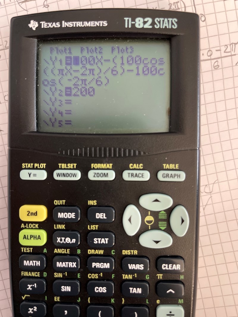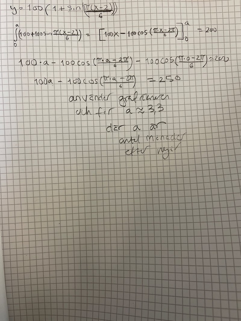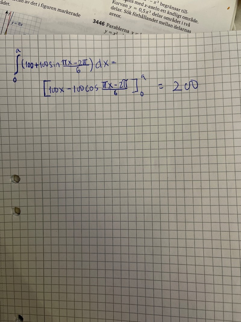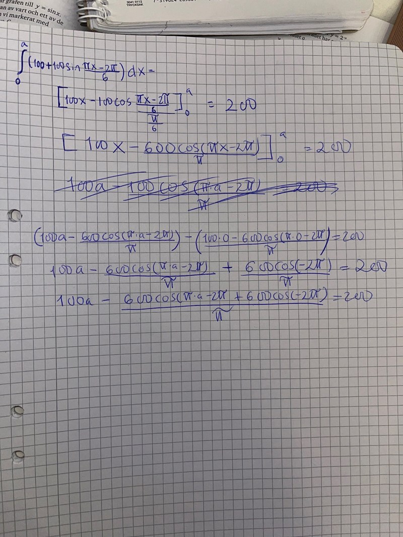 Den primitiva funktionen är 100a-600cos((pi*a-2pi)/pi) Är det den funktionen som ska lika med 250? Eller