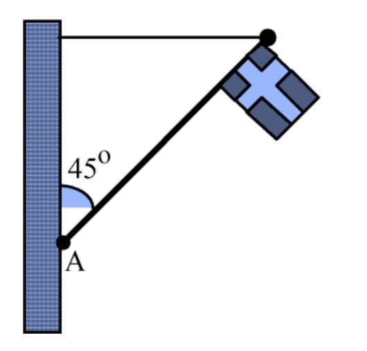 En flaggstång väger med flagga 53 kg. Flaggstången är 8,4 m lång. Flaggstången är fäst vid väggen dels vid punkten A, dels med en horisontell lina som går från flaggstångens översta ände. Tyngdpunkten hos flaggstång och flagga finns i stången 5,0 m från punkten A. Vinkeln mellan stången och väggen är 45 grader som figuren visar. Bestäm kraften i linan.