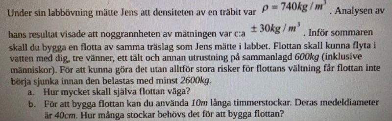 m.flotte = p*v och få fram massan. men när jag får fram svaret är det mindre än max lasten som är 2600 så jag tror att jag gjort fel där. (jag menar fråga a då)