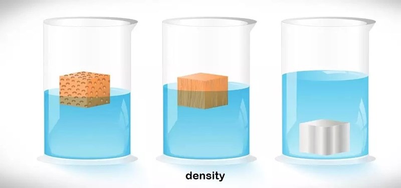 Det tredje föremålet (lika stort) har riktigt hög densitet. Det tränger undan ännu mer vatten, så att tyngden av det undanträngda vattnet "borde bli" lika med tyngden av föremålet. Men det kan naturligtvis inte tränga undan mer än sin egen volym, så lyftkraften kan inte bli mer än tyngden av just så mycket vatten - och det räcker inte.