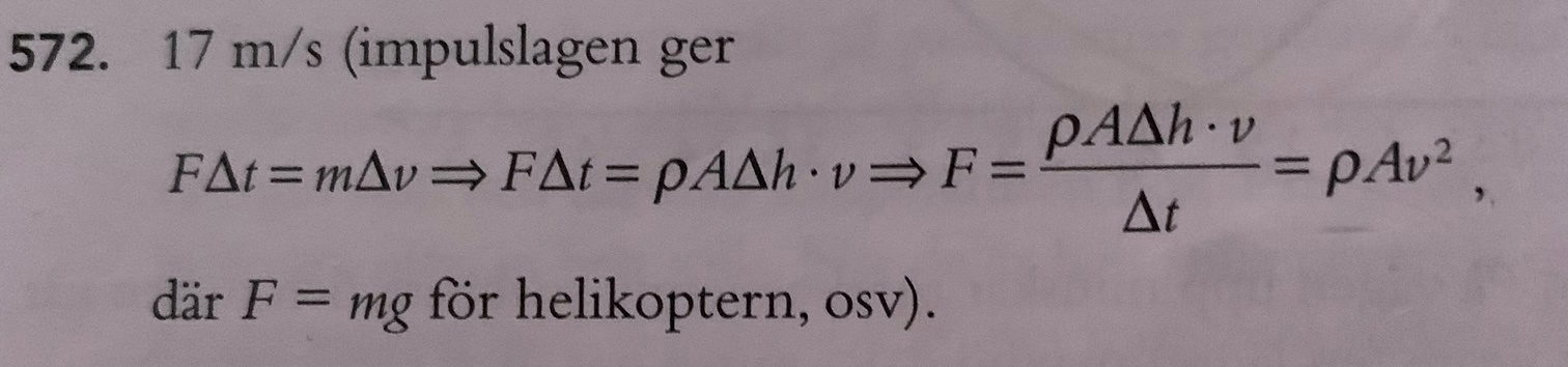 Frågan är "En helikopter hovrar(är helt stilla) på 10 meters höjd. Helikopter väger 6230kg och rotorn har diametern 14,6m. Vilken hastighet få luften som rotorn trycker neråt?"