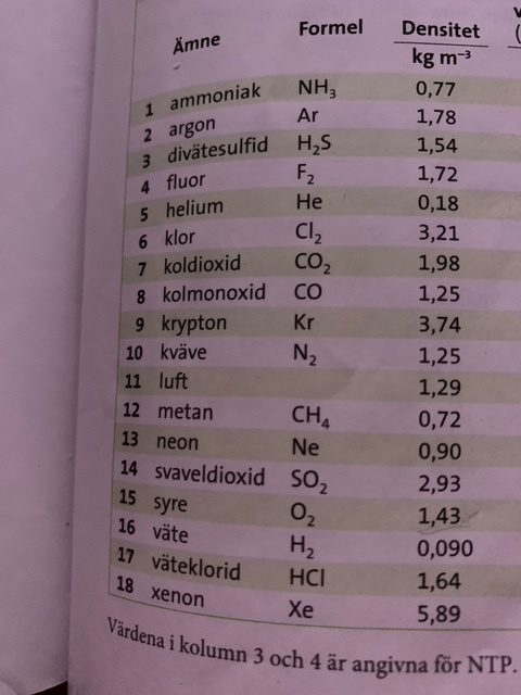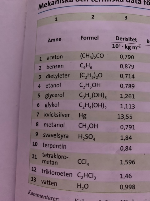 tex vatten så står det 0,998kg och för att omvandla det till kg/m^3 behöver man ta 0,998*10^3=998kg/m^3