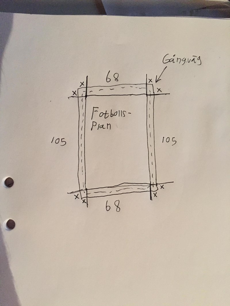 7. En fotbollsplan är 105 m lång och 68 m bred. Runt hela planen går x m bred gångväg.