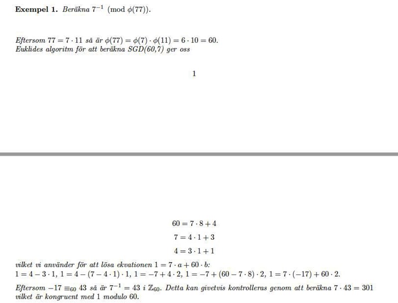 och varför använder man 7* 7 invers?Det står (mod phi(77)). phi(77) = 60, så (mod phi(77)) är samma sak som (mod 60).