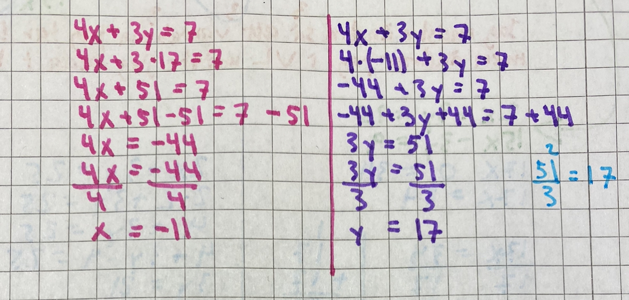 Vidare räkna jag fram y genom att placera in -11 i en av ekvationernas x värde och fick ut att y är 17.