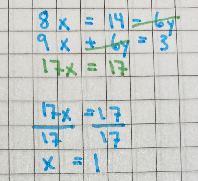 8x=14-6y (liksom då blir de ju så här att jag vidare får ut 17x=17 och jag fastnar)