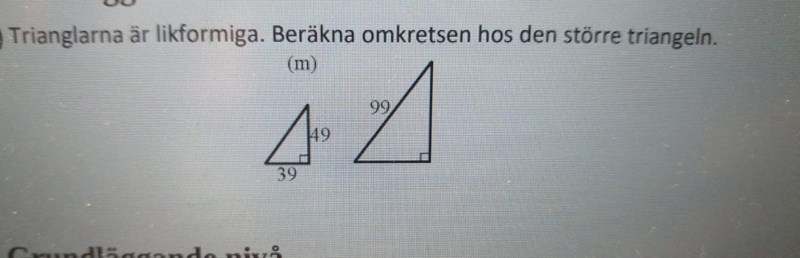 Jag rekommenderar att du istället först beräknar den lilla triangelns omkrets, dvs 39+49+62,63 = 150,63 och sedan multiplicerar detta värde med 1,58 för att få den stora triangelns omkrets, vilket då blir 150,63*1,58 238,12 och som du sedan avrundar till 240.