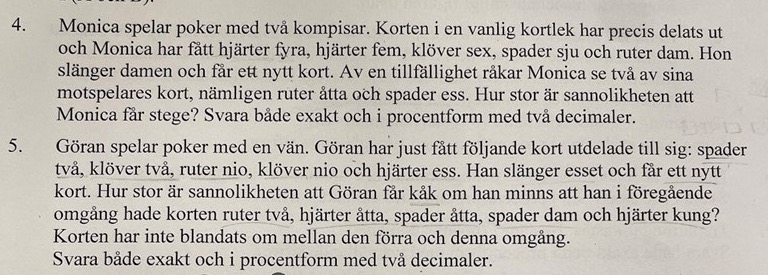 Hej! Jag har en fråga som handlar om hur man ska beräkna sannolikheten i frågor som dessa som jag bifogar i bilden nedan. Jag förstår nämligen inte hur man ska tänka kring att det som i dessa exempel om kortspel finns kort som är som ”dolda”. Det jag menar är att dessa kort inte finns med i högen som utgör de möjliga utfallen, utan korten är istället utdelade till de andra spelarna. Därför kommer personen som drar korten inte att välja bland dessa kort, men jag tänker att eftersom man inte vet vilka kort som de andra spelarna har så räknas de också som möjliga utfall. Stämmer det, eller hur fungerar det? Jag hoppas att ni kan förstå vad jag menar!