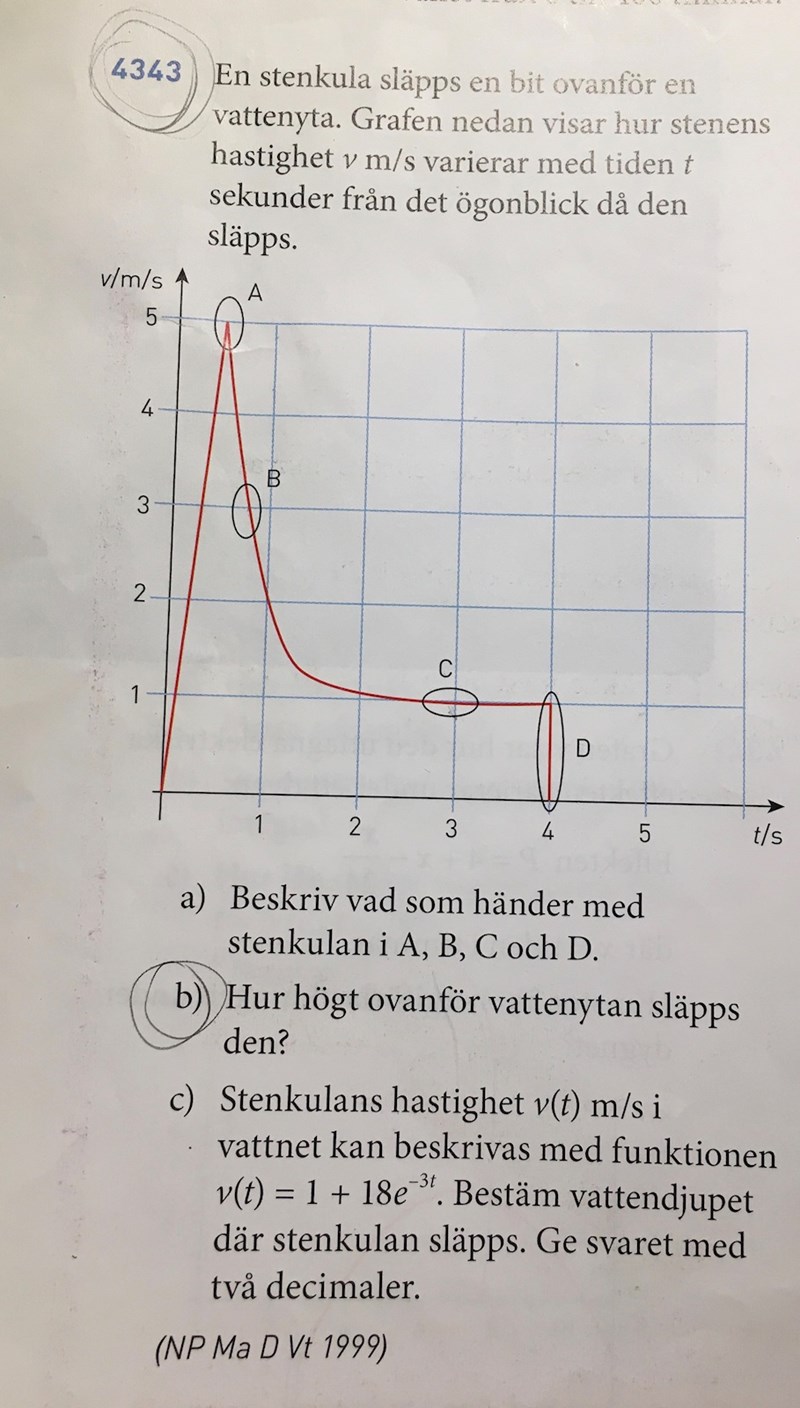 Jag har fastnat på b)-uppgiften. Ska jag räkna ut arean tills stenen träffar vattenytan, eller hur ska jag tänka?