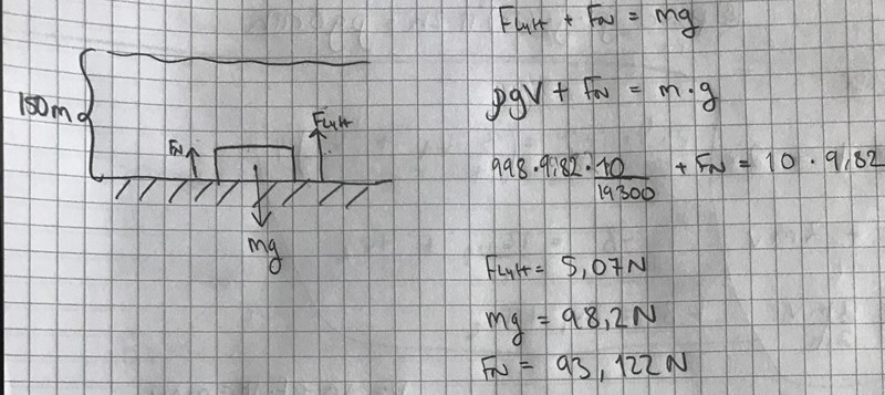 En guldtacka som väger 10 kg har olyckligtvis tappats i havet och den ligger nu på 150 m djup. Hur stor kraft behöver en person använda för att lyfta guldtackan?