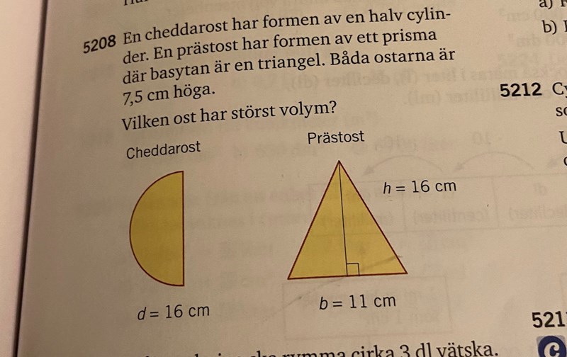 Yngve skrev:Cheddarostens volym: Beräkna volymen för en hel cylinder. Dela detta värde med 2. Klart.