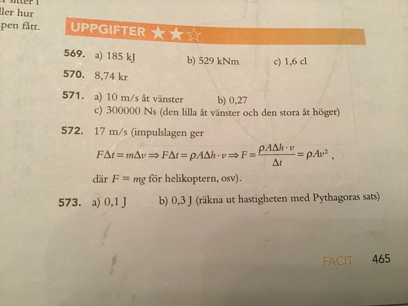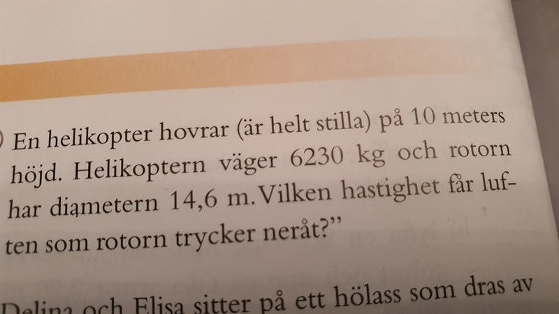 Jag vet inte hur man löser denna uppgift. Jag vet egentligen inte ens hur man börjar. Tänker att rotorn utför arbete på luften och men hur jag ska räkna ut arbetet vet jag ej. Och om den infon ens är nyttig tvivlar jag på.