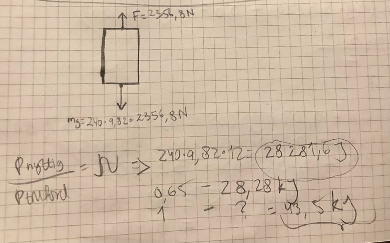 jag får svaret 43,5KJ . Jag utgår från att den nyttiga energin är mgh=240*9.82*12=28281.6J