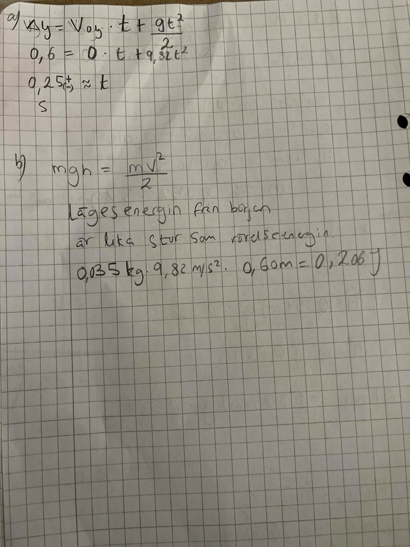 I a) inser att jag har glömt dela med 2. Svaret ska istället bli t~0.34 s