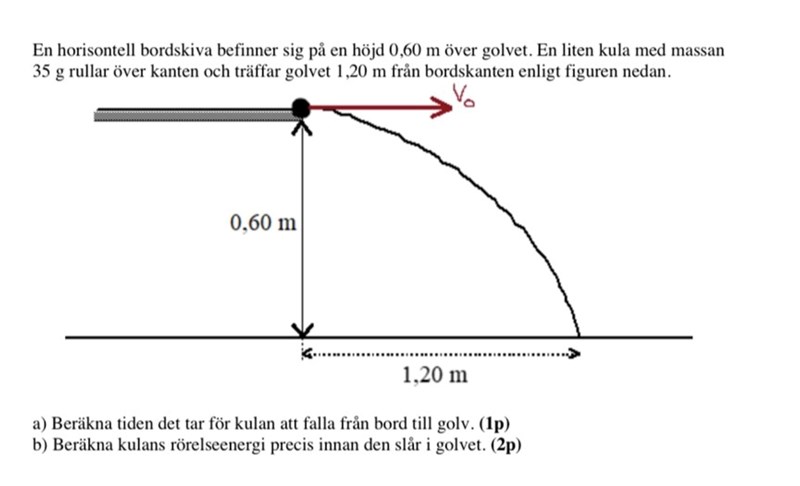 Du har redan en designation på hastigheten vid bordskanten enligt din figur. Den var . Du vet tiden och du vet sträckan den rört sig i x-led. Således kan du bestämma . Detta eftersom du inte har någon acceleration i x-led (luftmotstånd försummas).