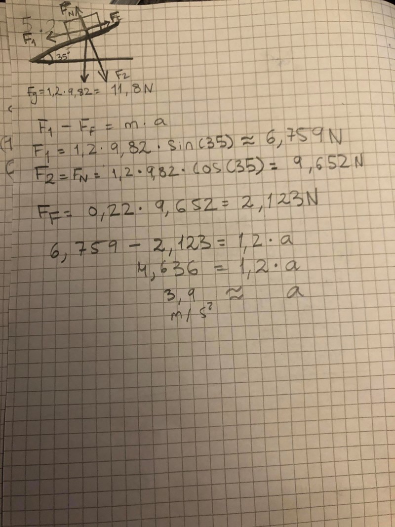 med g ≈ 9.8 m/s^2, v = 35° och μ = 0.22.