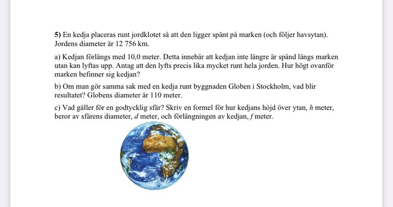 Mitt förslag är att börja med uppgift b, Globen. Det är mer 'normala' tal och man slipper omvandling mellan km och m.