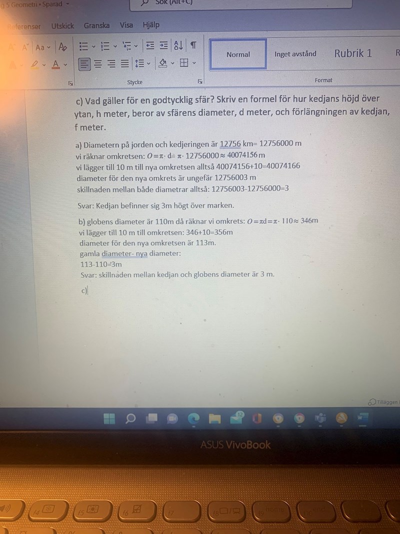 a) Kedjan förlängs med 10,0 meter. Detta innebär att kedjan inte längre är spänd längs marken utan kan lyftas upp. Antag att den lyfts precis lika mycket runt hela jorden. Hur högt ovanför marken befinner sig kedjan?