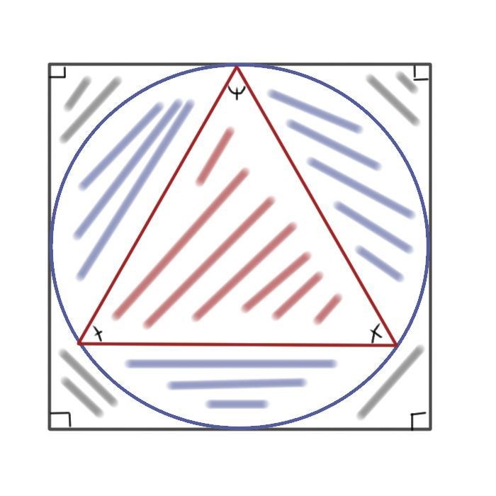 En liksidig triangel är inskriven i en cirkel, som i sin tur är inskriven i en kvadrat. Vilken area är störst, respektive minst?